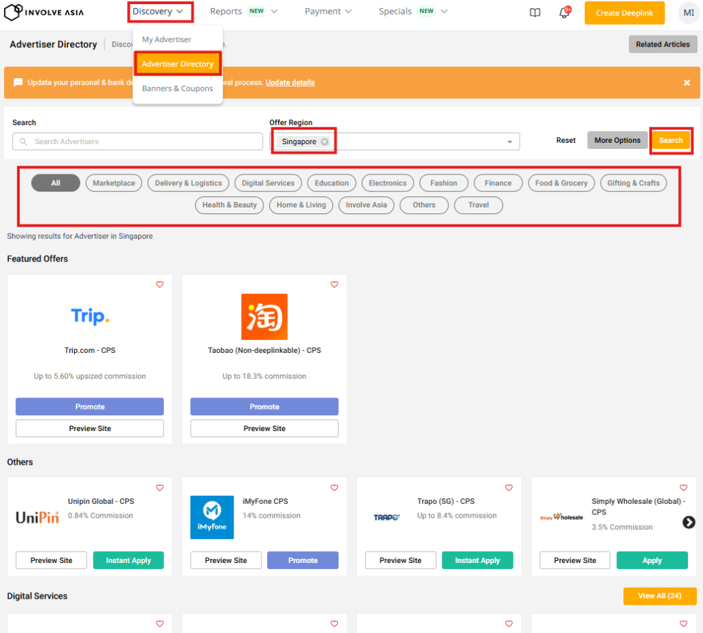 Go to Discovery → Advertiser Directory and search for brands or offers that match your audience.