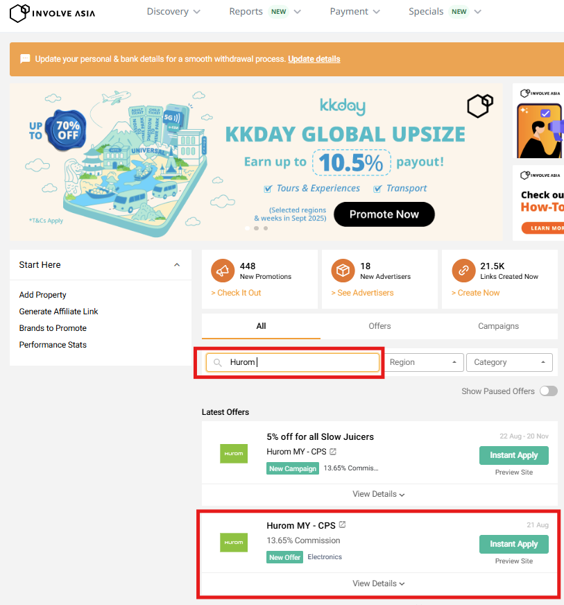 The Hurom affiliate program on Involve Asia is completely free to join. There are no hidden costs, membership fees, or product purchase requirements. Once approved, affiliates gain instant access to official tracking links, banners, and creatives to help them promote Hurom products effectively. It’s a low-risk opportunity to partner with a wellness brand and start earning commissions by recommending products people already trust.
