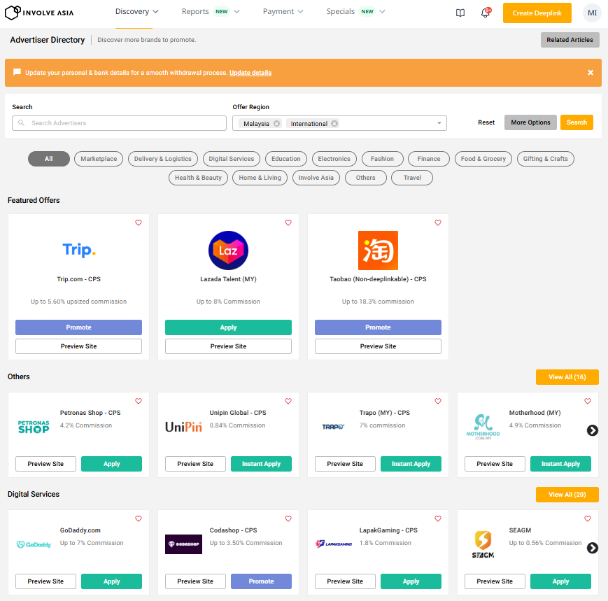 Once you meet the basic Involve Asia affiliate requirements and get approved, you can work with multiple advertisers and monetise the content and traffic you already have.