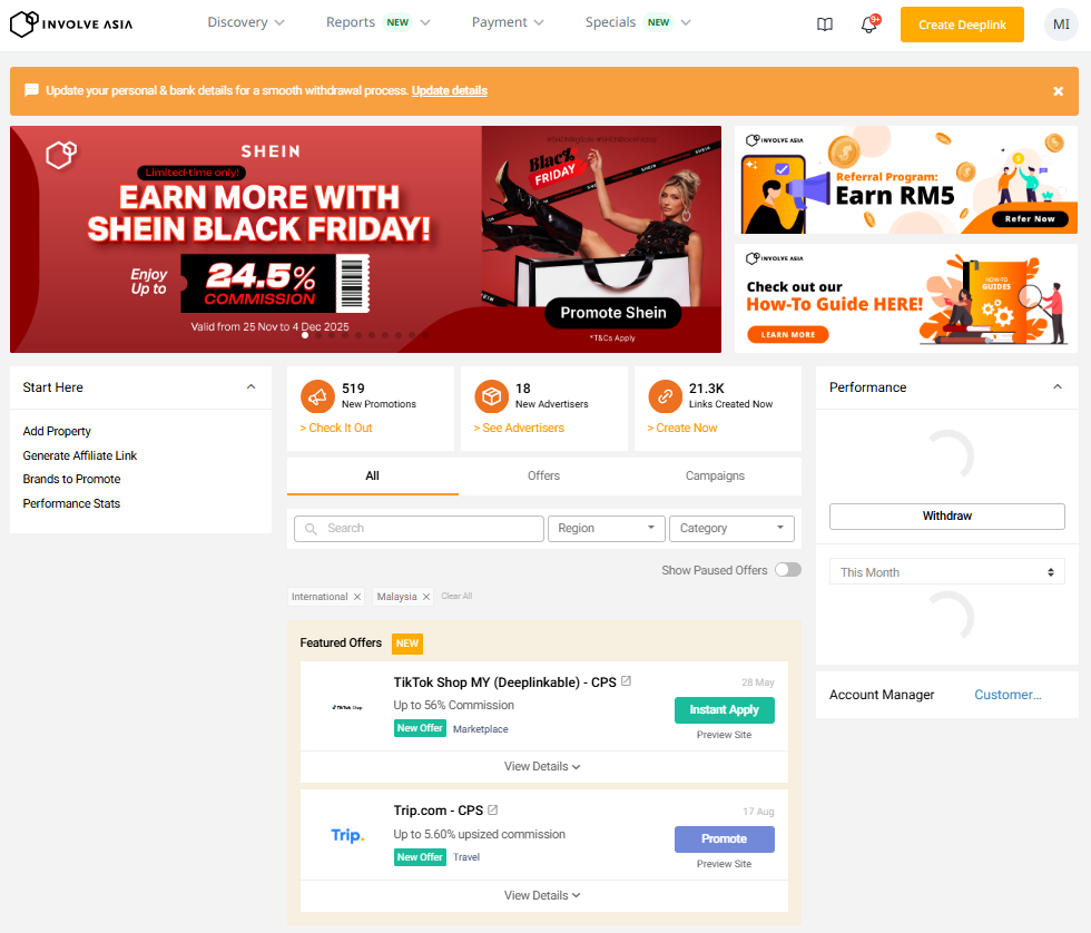 Involve Asia is a performance marketing platform built for Southeast Asia. Partners such as content creators, deal sites, cashback platforms, bloggers, review sites, and app developers earn commissions by promoting brands through affiliate links.