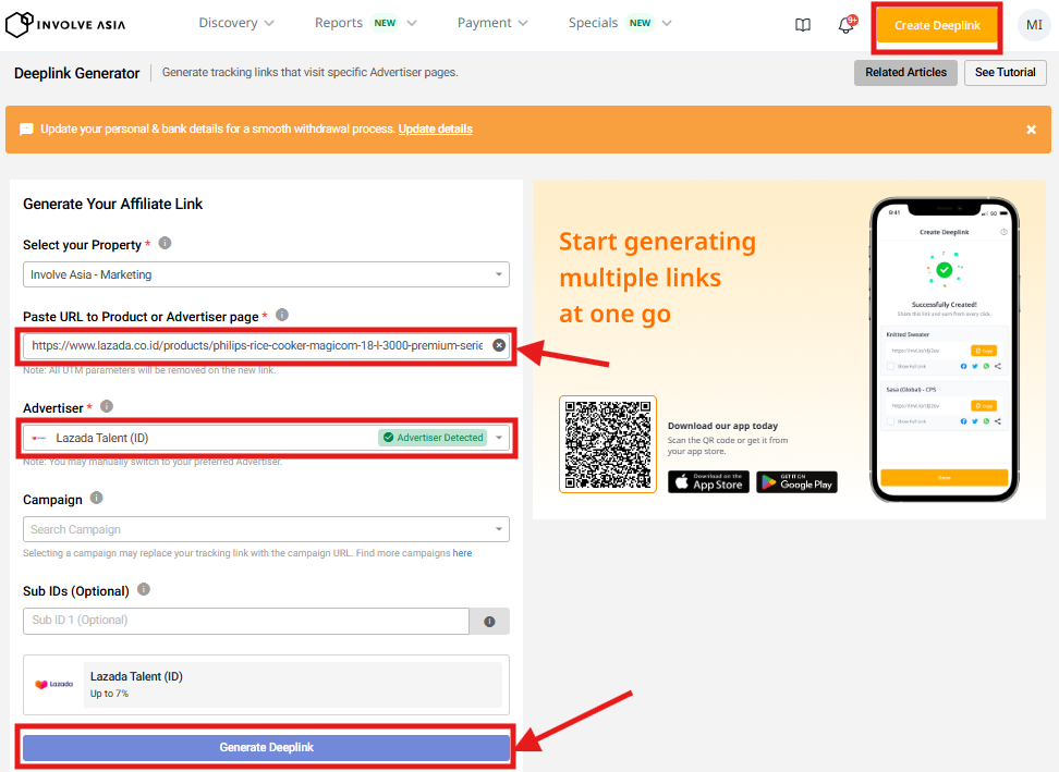 Make sure your profile or content is active, clearly shows how you plan to promote Lazada products, and complies with Involve Asia’s publisher policies. You’ll receive an email notification once you’re approved, and then you can start generating affiliate links and earning commissions.