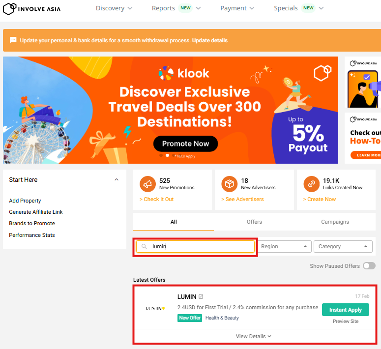 Promoting the Lumin affiliate program on Involve Asia gives you access to centralized tracking, reporting, and payouts so you can focus on content instead of technical setup. It also makes it easier to test and scale your affiliate strategy because you can promote Lumin alongside other relevant brands in the same dashboard.