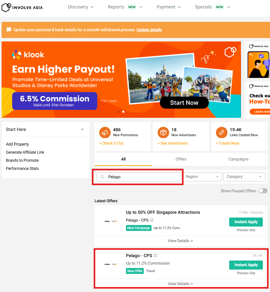 The Pelago affiliate program on Involve Asia is free for all publishers. There are no signup costs, hidden fees, or monthly charges. Once you register and get approved, you’ll gain access to affiliate links, marketing tools, and reporting features that help you start promoting Pelago’s activities immediately.