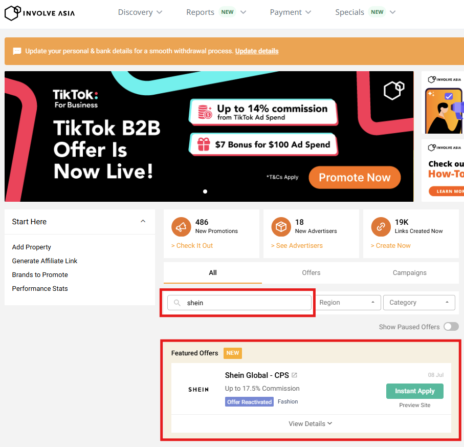 To apply, publishers need to complete the SHEIN affiliate program application within Involve Asia’s Marketplace. Once accepted, they can access affiliate tools and creatives. Performance is tracked through the affiliate dashboard, where affiliates can log in to monitor real-time data on clicks, sales, and commissions. The dashboard also provides reports to help optimize campaigns and maximize conversions, ensuring transparency and control over every promotion.