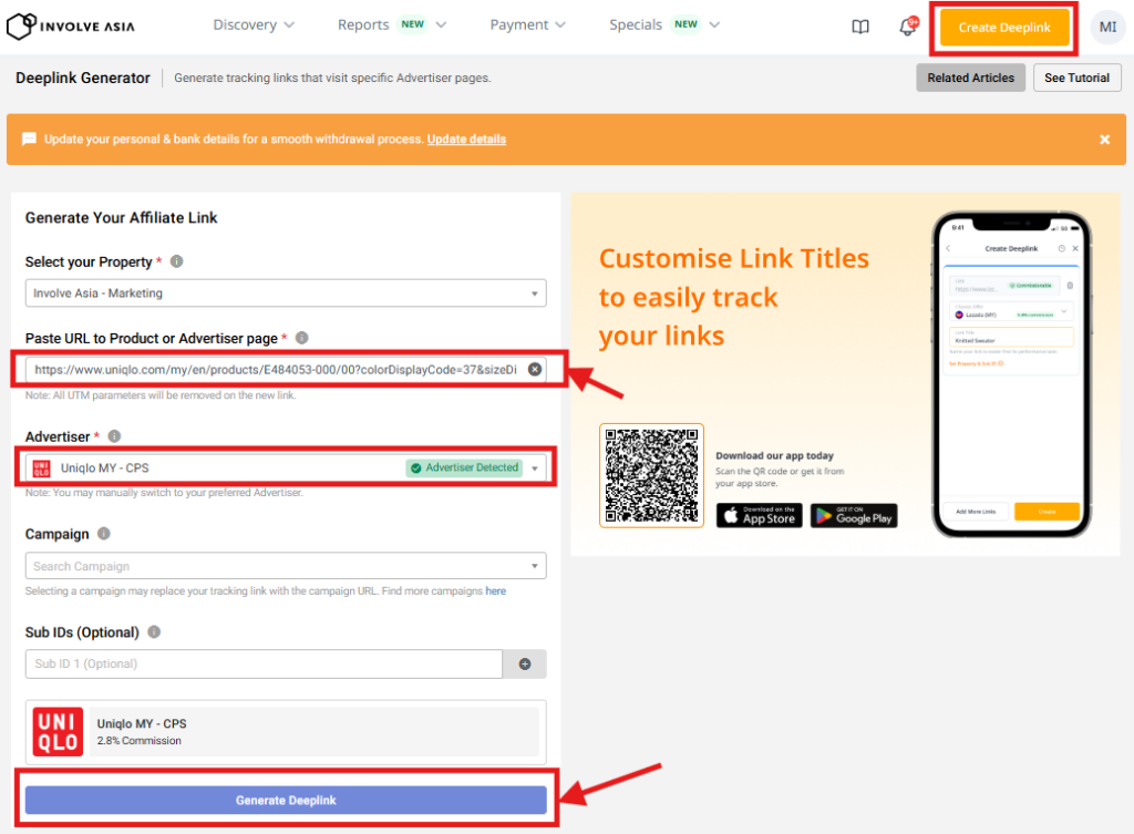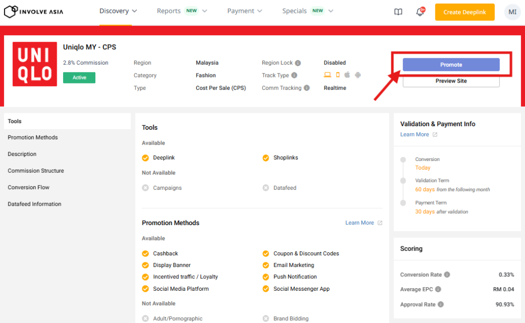 To join the UNIQLO affiliate program on Involve Asia, first log in to your Publisher Dashboard and navigate to Discovery → Advertiser Directory. Search for “UNIQLO,” and if the program appears, open the advertiser page to review its commission structure, rules, and traffic guidelines. Click Instant Apply or Apply, depending on availability. Once approved, you can immediately generate tracking links or deeplinks and start promoting UNIQLO products across your social media channels, blog, or content platforms.