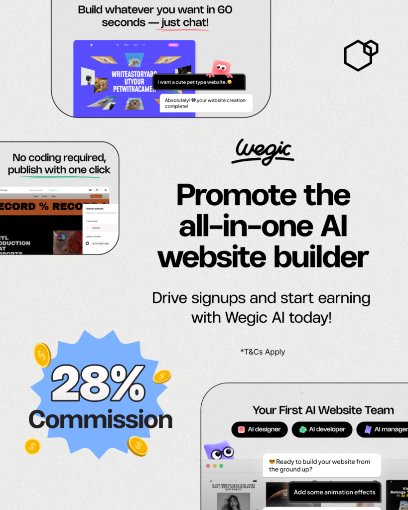 The Wegic AI affiliate program on Involve Asia gives publishers a strong way to earn by promoting an all-in-one AI website builder. Wegic AI helps small and medium-sized businesses, solopreneurs, freelancers, and creators build professional websites in minutes – no coding, design skills, or hosting setup required.