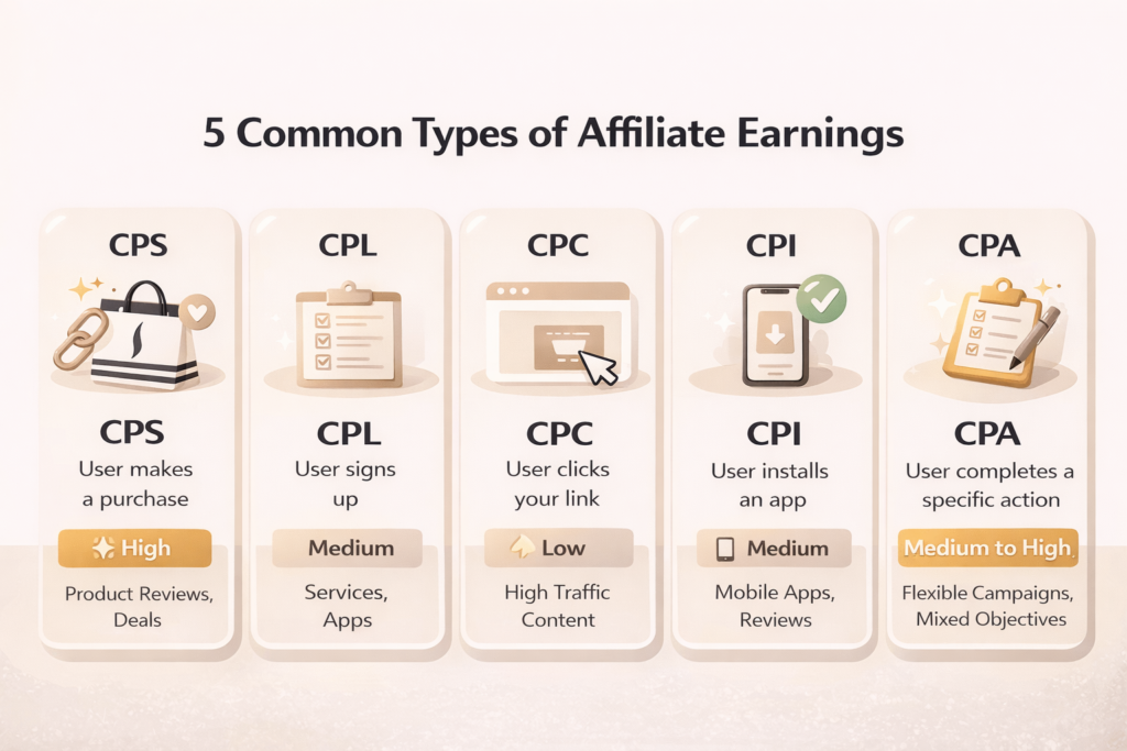 - Affiliate earnings come from user actions like purchases or sign-ups
