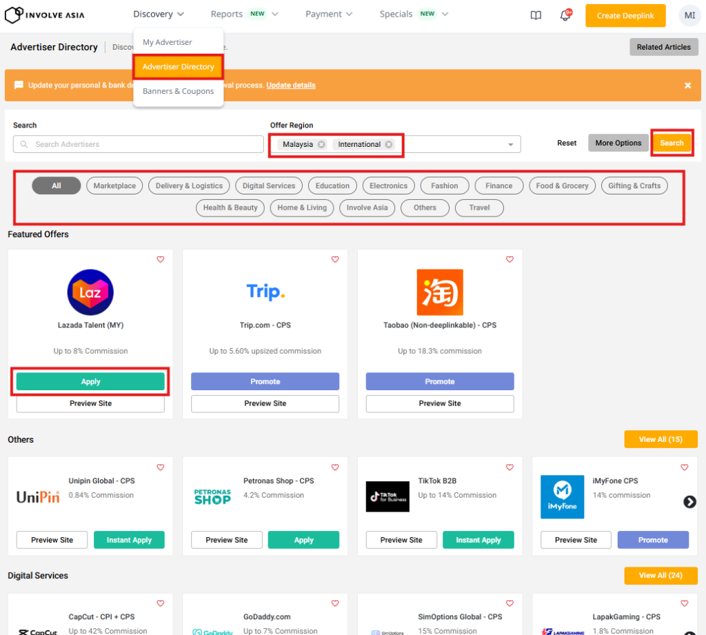 On Involve Asia, you can promote products across many categories, including both Southeast Asia-focused and global brands.