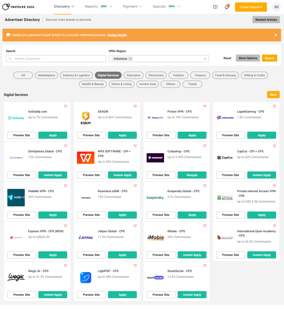 Berikut ini adalah 11 program affiliate digital Indonesia di Involve Asia yang populer, mudah dipromosikan, dan memiliki potensi konversi tinggi.