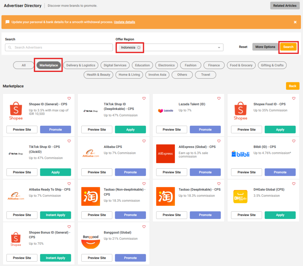 Jika kamu ingin mulai affiliate dari kategori yang cepat dipahami audiens, marketplace adalah pilihan yang kuat. Dengan 9 program affiliate ecommerce marketplace Indonesia di Involve Asia seperti Shopee, TikTok Shop, Lazada, hingga Banggood, kamu bisa menyesuaikan promosi sesuai niche – mulai dari deal hunter, beauty, tech, sampai bisnis.